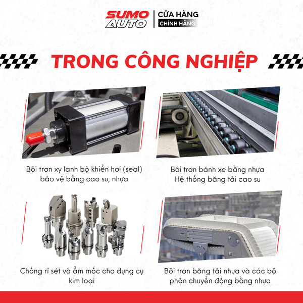 Công nghiệp: Ứng dụng trên ray trượt, trục động cơ, máy móc để giảm ma sát và tăng tuổi thọ thiết bị.