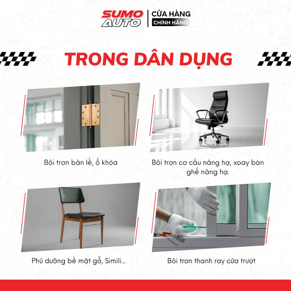Hộ gia đình: Sử dụng cho ray cửa, cửa sổ, bản lề, loại bỏ tiếng kêu và tăng độ trơn tru.