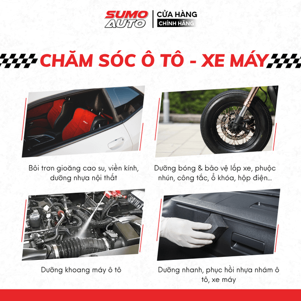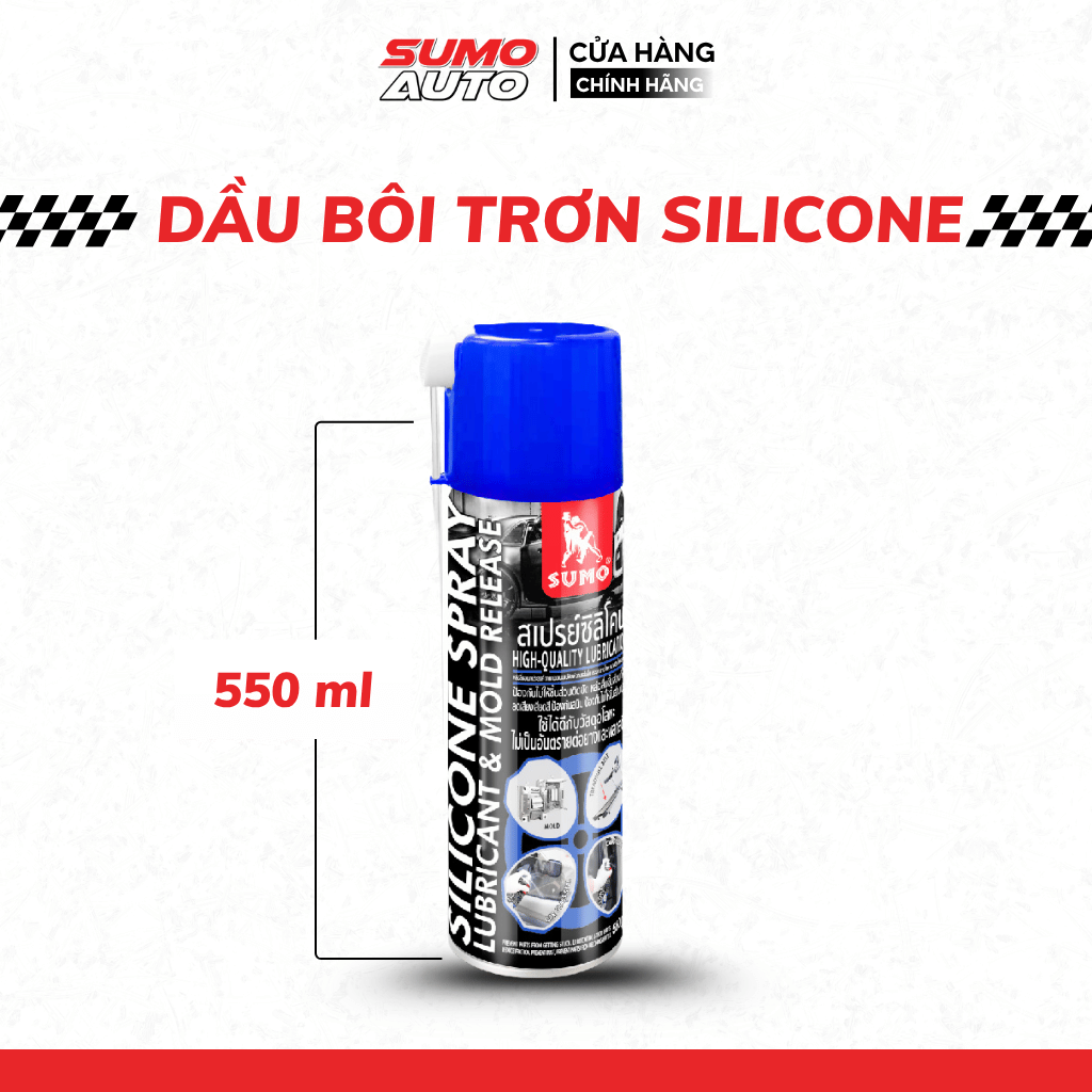 Trong bảo trì - bảo dưỡng - chăm sóc phương tiện dầu bôi trơn đa năng Silicone 550ml Sumo Industrial là giải pháp bôi trơn đa năng, không thể thiếu cho ô tô, xe máy và xe đạp. Sản phẩm giúp giảm ma sát, ngăn kẹt cứng cho các bộ phậngioăng cao su, bản lề cửa, dây đai, đảm bảo vận hành êm ái và giảm mài mòn. Với lớp màng bảo vệ chống gỉ sét và ăn mòn, silicone giữ cho các chi tiết kim loại như khung xe đạp, động cơ ô tô bền bỉ trước độ ẩm. Đặc biệt, sản phẩm bảo vệ cao su (viền cửa, lốp xe) và nhựa (bảng điều khiển, yên da), giữ chúng thẩm mĩ, ngăn nứt gãy do thời tiết, môi trường